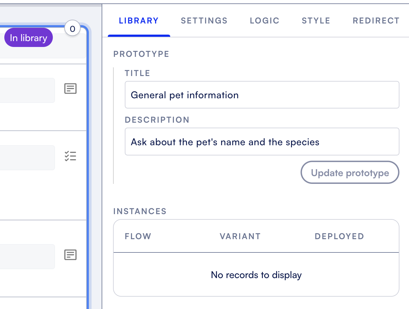 At this point, the item will be in the library, and you will see that the source step (the **prototype**) will have a small **In library** badge on it. It's possible to update the metadata in the settings sidebar, as well as to view the instances of this library item in other flows. Since we just added this item to the library, there are no instances of it in use yet.