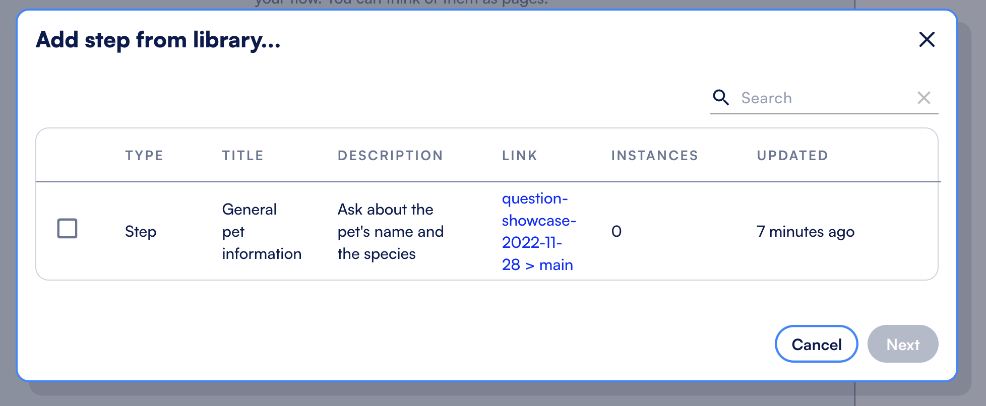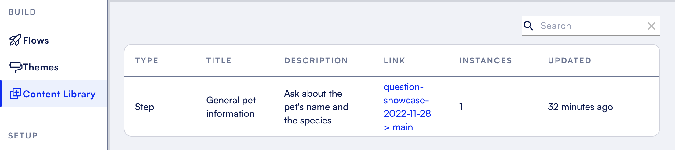 The content library allows for adding groups, steps, or questions to a central content library as **prototypes**. **Instances** of those prototypes can then be inserted into other flows. Changes to the prototype will be automatically reflected in the instances once they are re-deployed.