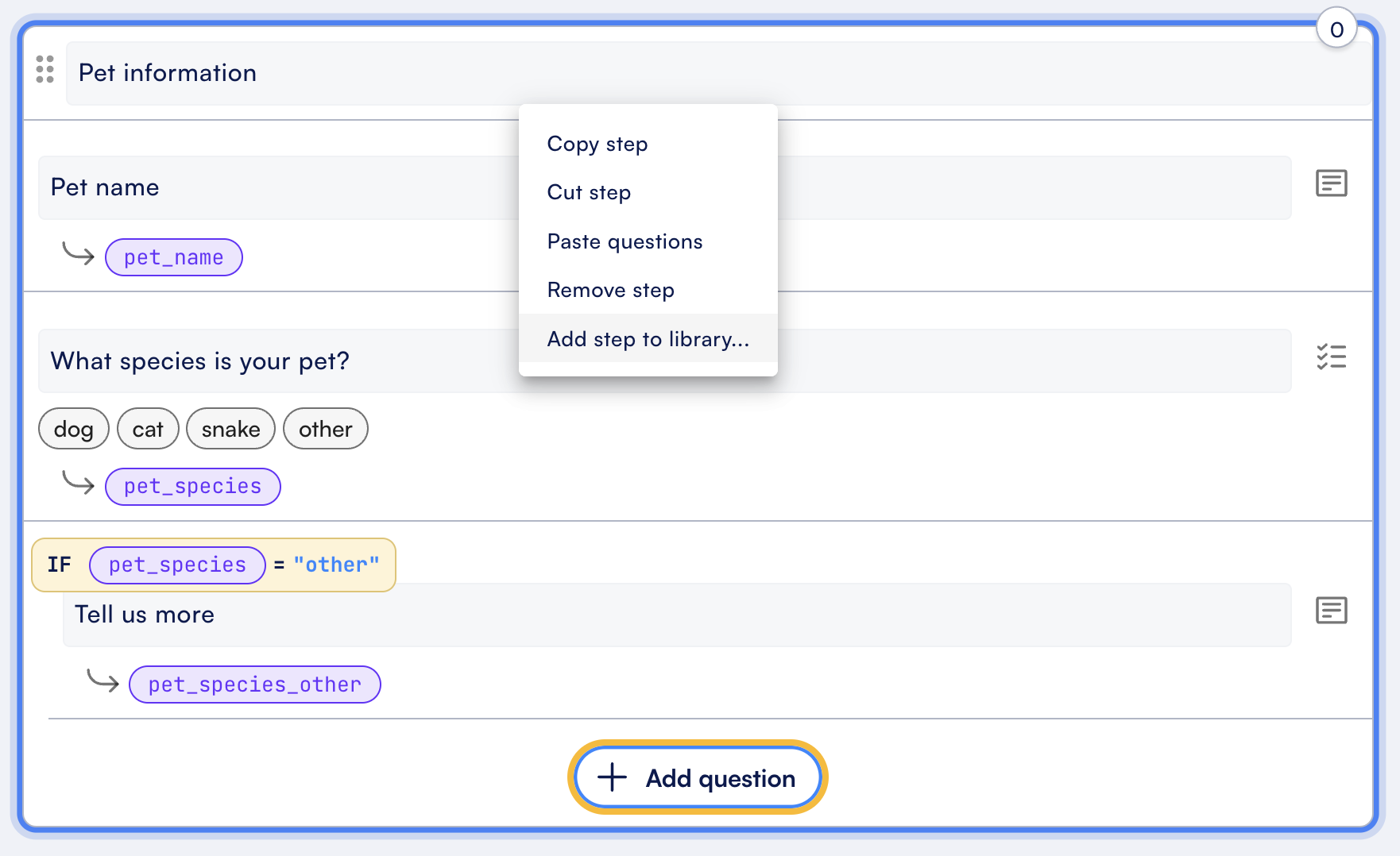 To add a group, step, or question to the content library, right click it, and choose **Add to library...**
