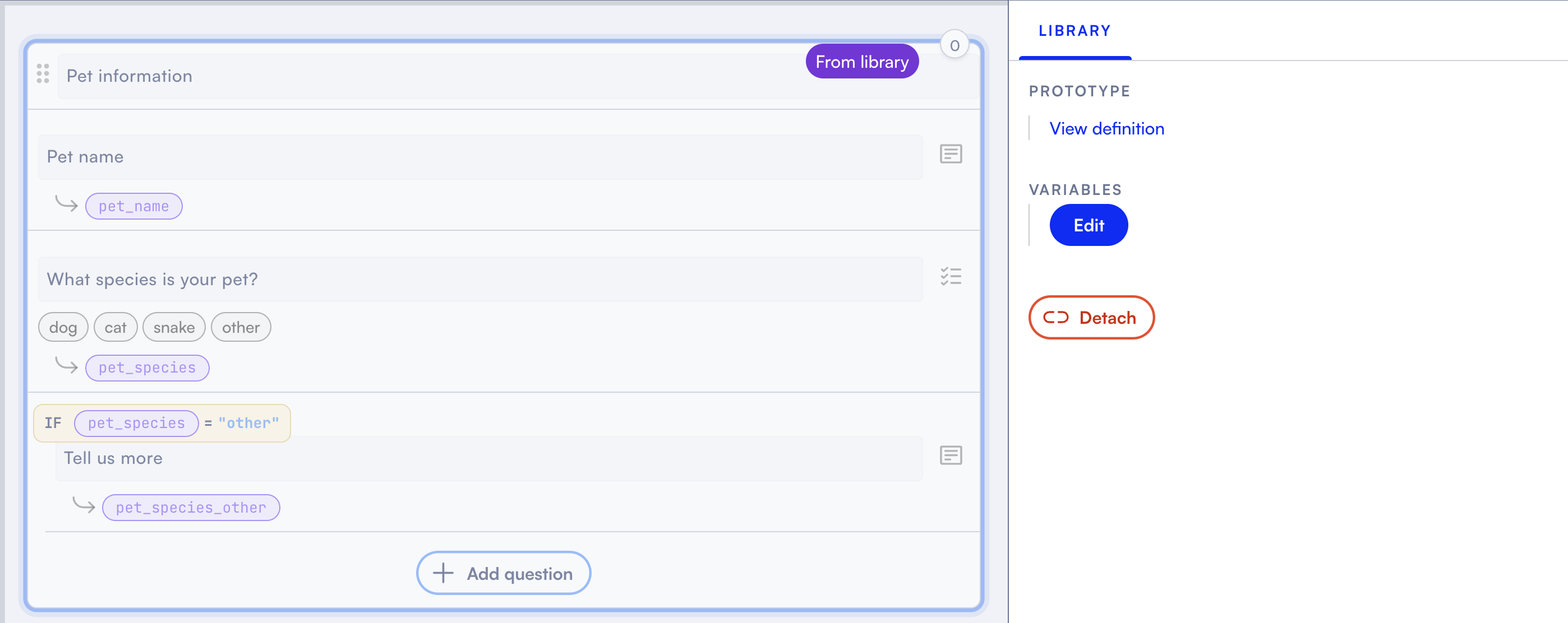 **Detach** can be used to remove the association between this instance and the prototype. After being detached, the content (and any child content, like steps or questions within) will behave exactly like normally-created content will, and will no longer receive updates from the prototype.