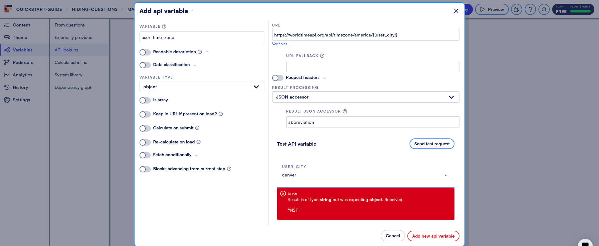 * Add a variable name, and set the [**variable type**](https://docs.formsort.com/building-flows/schemas/api-answers#variable-type). Variable type is the expected data type we’ll be receiving from the API response (i.e. string, number, boolean, object, array).