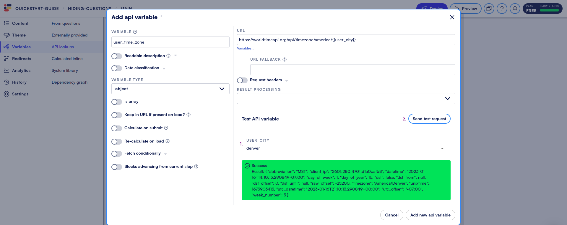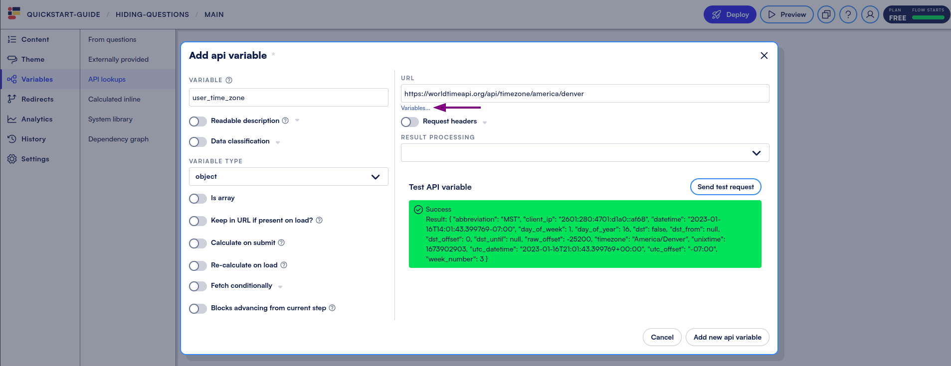 * Head into **Variables** → **API lookups** and then “**+Add api variable**”.