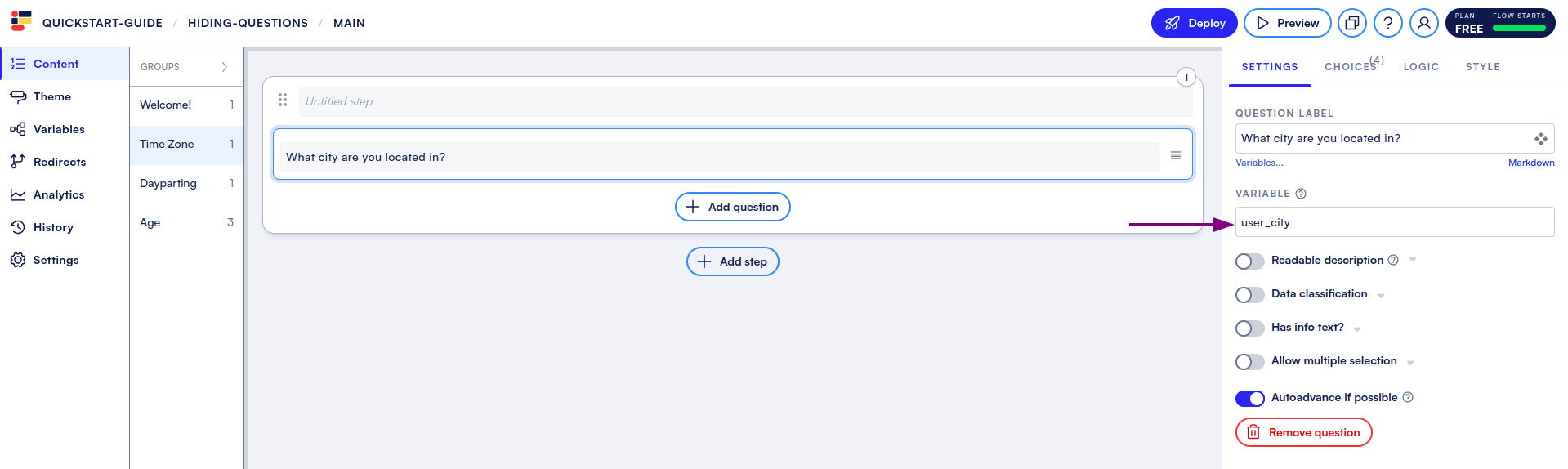 We have the question we need to grab our user’s city, and we have confirmed that our API call will work with that information. All that’s left to do is create logic on the questions we want to hide, depending on the user’s time zone.