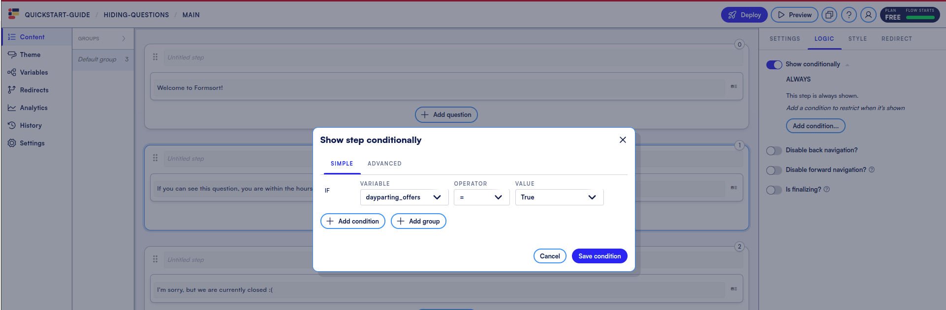Now, lets use this variable to create logic on steps we only want available inside the hours of operation.