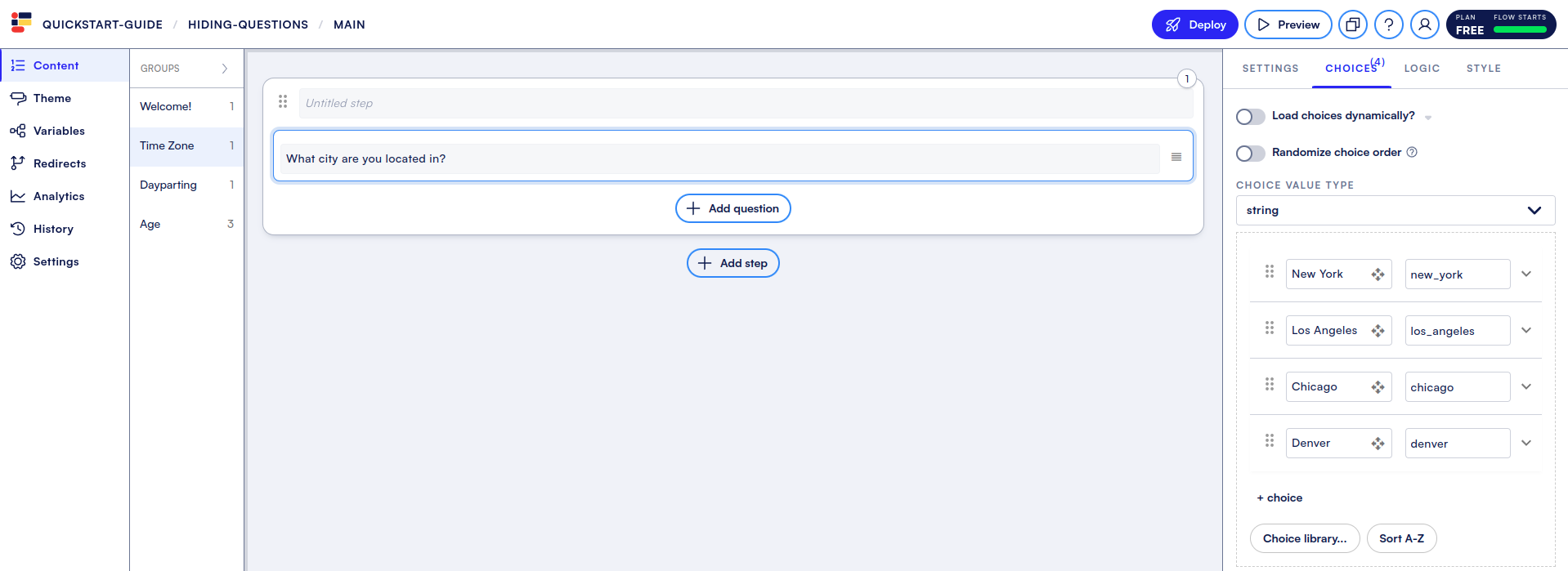* Now, when a user answers “Denver” to question 1, they will not see question 2, and will instead skip to question 3. Try it out in Live Preview!