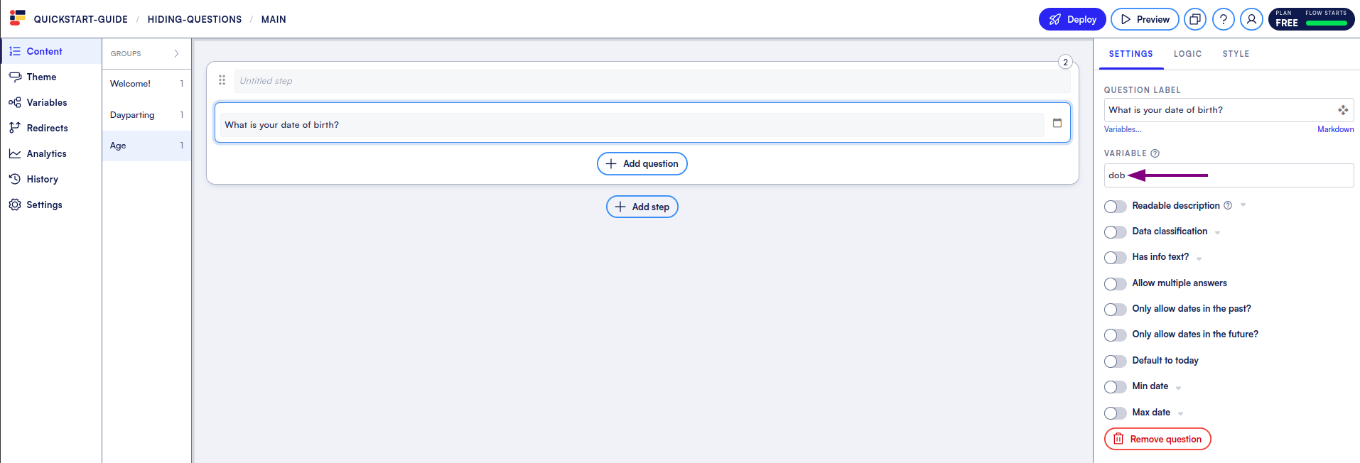 * At the desired step, choose “Add question” and select the [Date](https://docs.formsort.com/building-flows/content-types/date) component. Set the **Variable** name (we’re using `dob`).