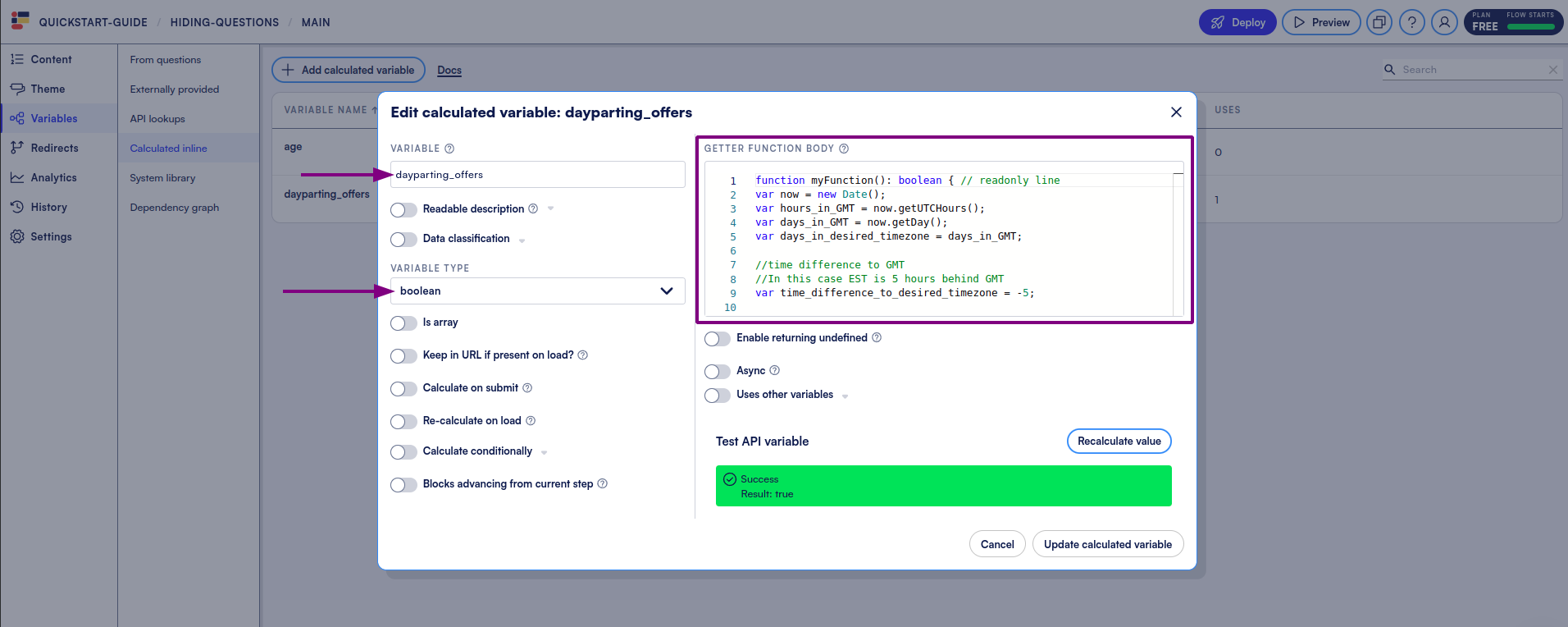 Let’s give the variable a name - we’ll call this one `dayparting_offers`, change the Variable Type to `Boolean` so Formsort knows to expect a T/F return, and drop the code into the **Getter Function Body**.