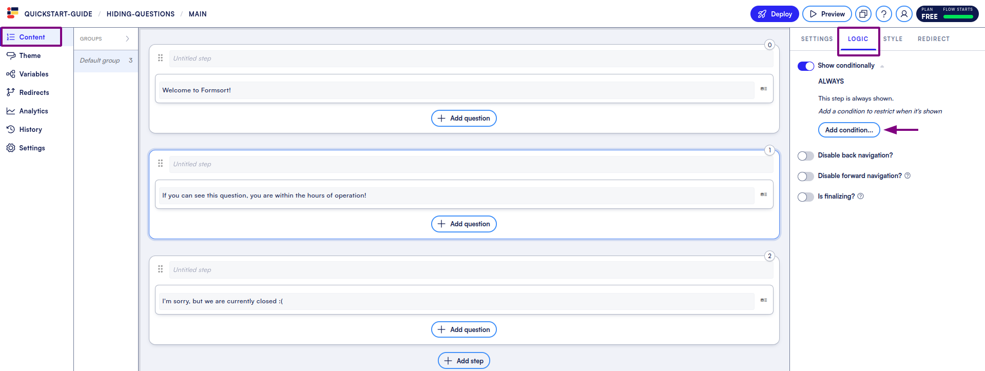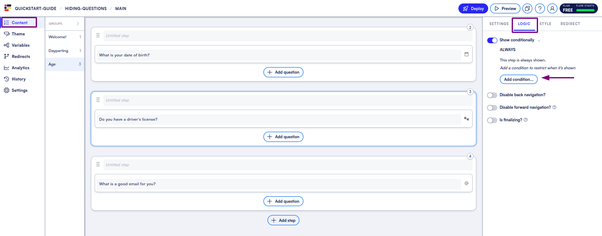 * In **Content**, head to the step we’re putting the logic on. Here, it is going to be Step 3.