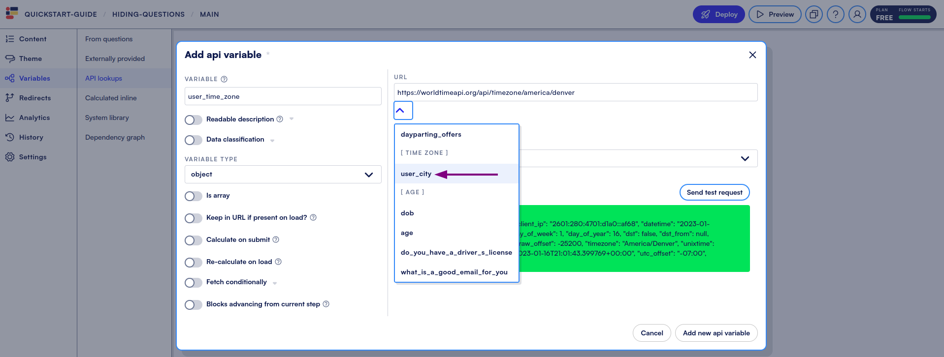 In the example below, we will [**template**](https://docs.formsort.com/building-flows/adding-content/using-answers-in-templates?q=templat) a user’s response into our call to the [World Time API](http://worldtimeapi.org/) to determine their timezone, and thus determine which questions to hide.