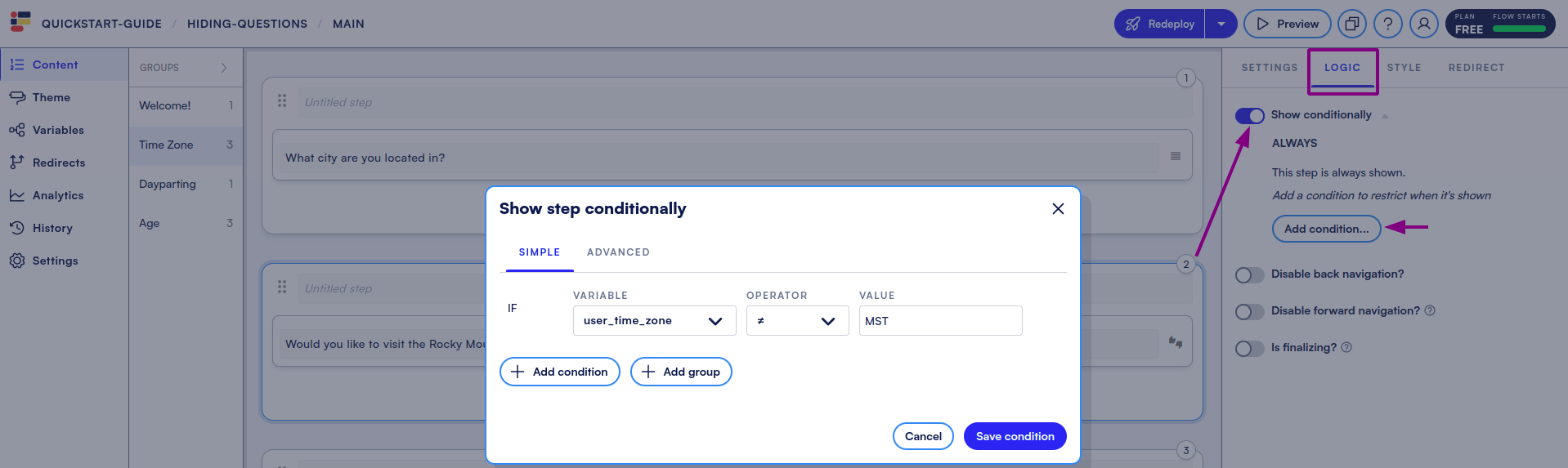 * Let’s create a Step that will not be available to users in “MST”. On that step, head to **Logic**, toggle **Show conditionally** on, and create the logic required. **Save condition**.