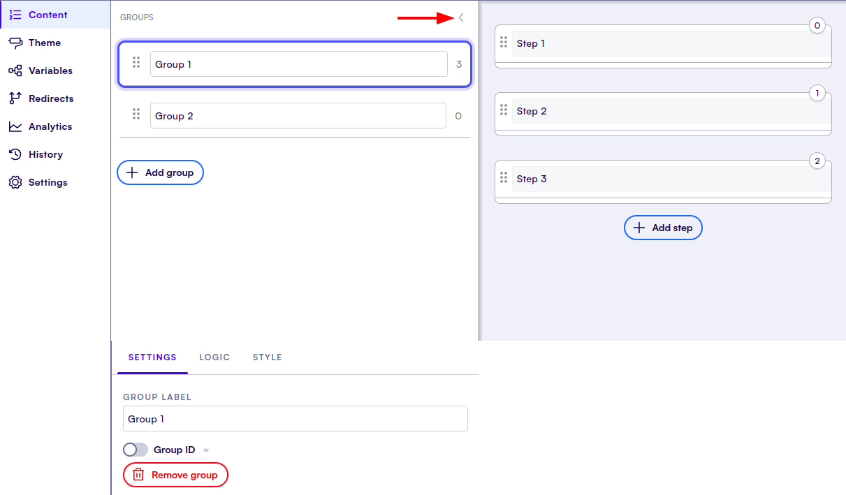 To add a group, click **Edit groups** when hovering the left-side groups editor, or click the arrow at the top right.