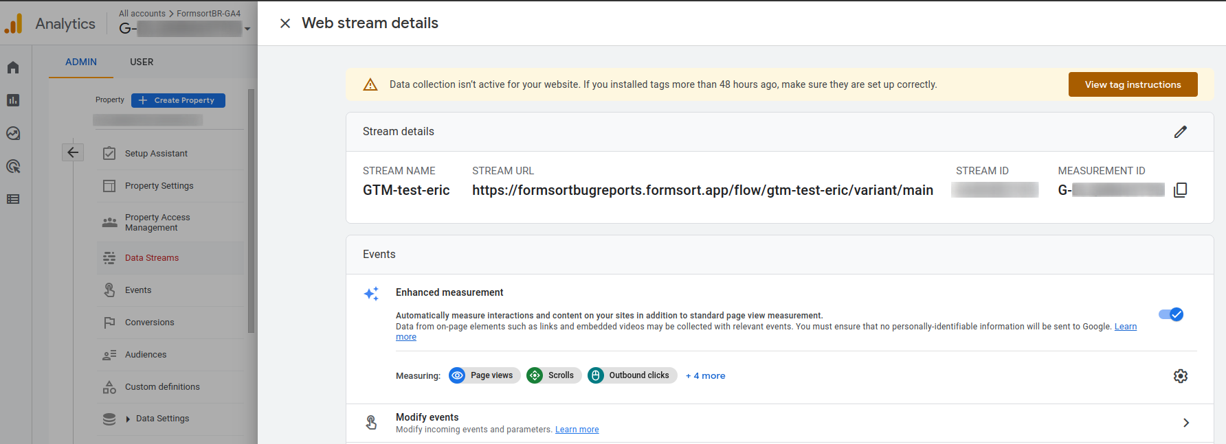 As stated at the beginning of this article, at this time GA4 must be loaded through our [GTM Integration](https://docs.formsort.com/integrations/integration-reference/google-tag-manager). In order to do this, you're going to need the **Measurement ID** of the property.&#x20;