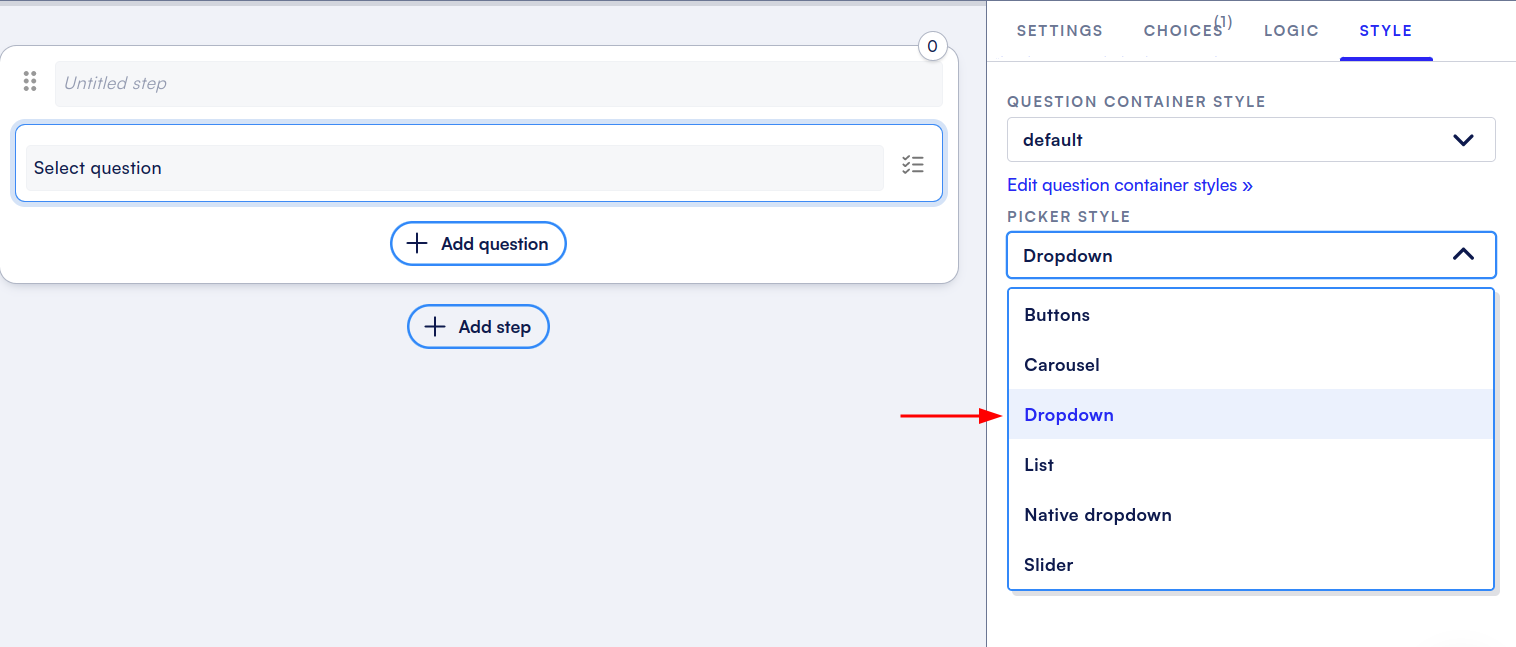 Dropdowns are styled [Select](https://docs.formsort.com/adding-questions-and-content/question-reference/select) questions. With the Select question highlighted, click on the **Style** tab and select **Picker style** -> **Dropdown**.&#x20;