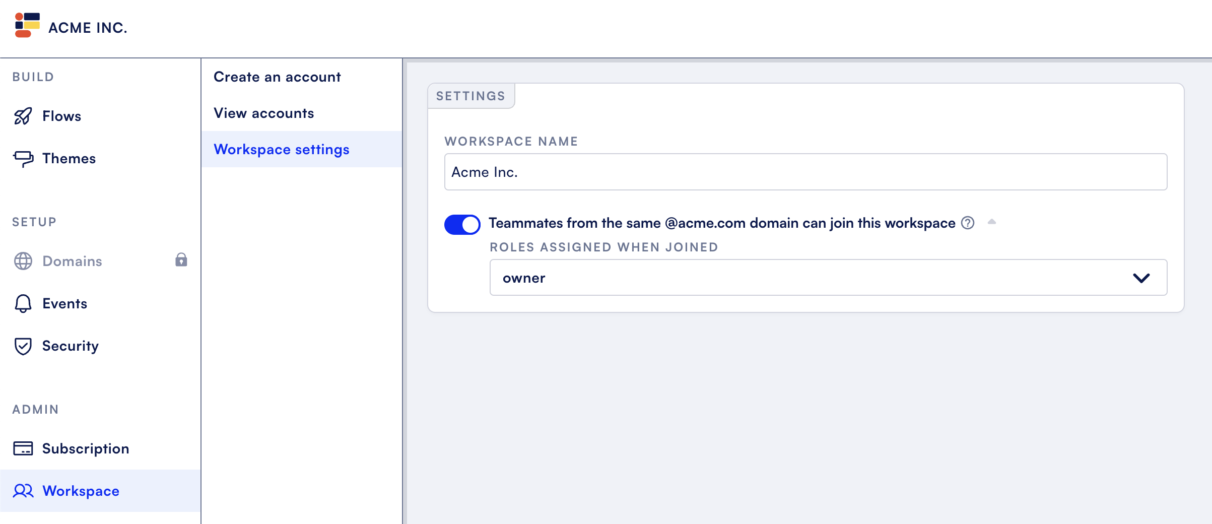 Each workspace can choose whether or not their workspace is automatically detected by accounts sharing the same domain. The domain is taken from the first account that created the workspace, and cannot be changed. By default any new accounts are given the `owner` role for the workspace.